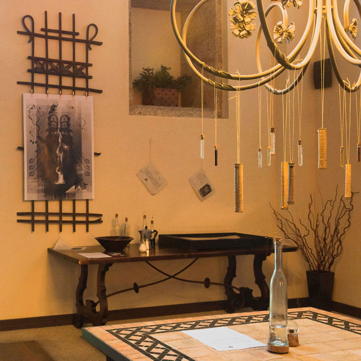 Instalación de los amuletos, botella de lluvia de santiago, bola de cristal con las 9 olas de La Lanzada. Rincón de “A Queimada” con piezas e instalación.