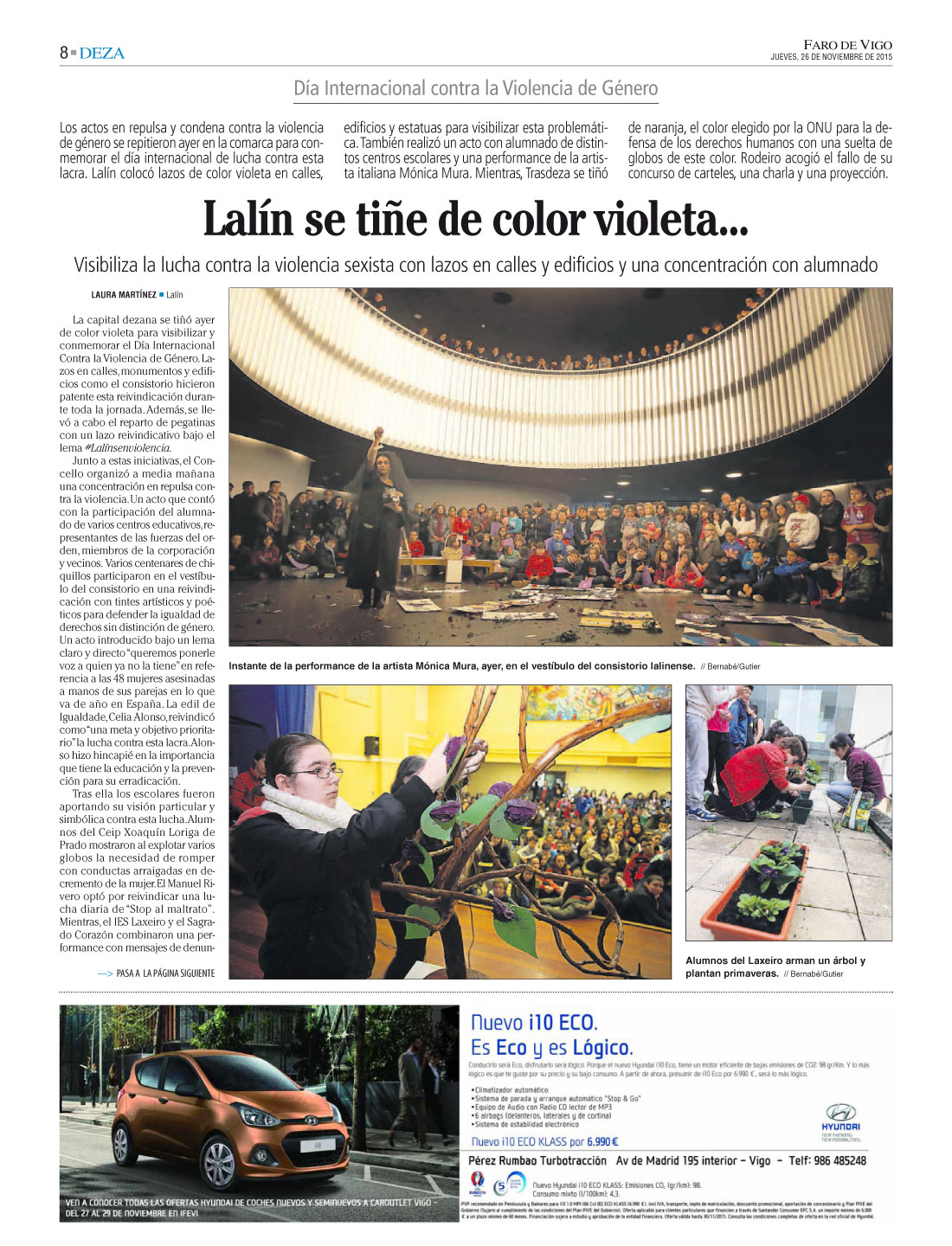 … La sesión en el consistorio se completó con la performance Me ama no me ama de la artista italiana afincada en Galicia, Monica Mura, que echó mano de crisantemos rojos, arroz negro y papeles con los nombres de víctimas para recordar a las mujeres asesinada. Una representación que también se llevó a cabo por la tarde en el centro comercial Pontiñas y que se incluía dentro e los actos programados por la Diputación en diez municipios. De hecho, también se realizó una conexión por videoconferencia […] leer más