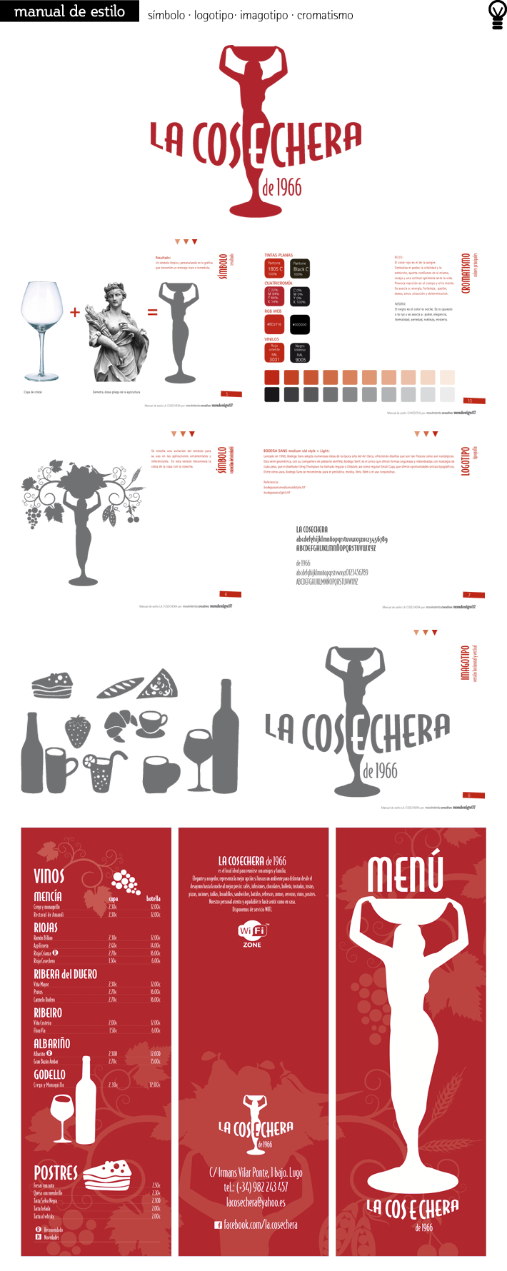 PARA LA COSECHERA es un local elegante pero al mismo tiempo familiar y acogedor donde poder disfrutar desde la mañana hasta la noche, de una amplia selección de los mejores productos y servicios de hostelería. INFORMACIÓN: SÍMBOLO, LOGOTIPO, IMAGOTIPO, LEYENDA, CROMATISMO, DECORACIÓN. Menú, lista de precios. Imagen acorde con este espíritu, que acompañe tanto por el día a la hora de los desayunos como por la noche a la hora de elegir un cóctel. Para ello, hemos analizado y elegido distintos elementos para fundirlos gráficamente en un único símbolo. Cosechero, ra. (1. adj. Perteneciente o relativo a la cosecha / 2. m. y f. Persona que tiene cosecha). Copa de Cristal (Utilizada en hostelería con distintos diseños, para el servicio de agua, vino, cerveza, refrescos, copas y “cubatas”). Demetra (Diosa griega de la agricultura, nutricia pura de la tierra verde y joven, ciclo vivificador de la vida y la muerte).