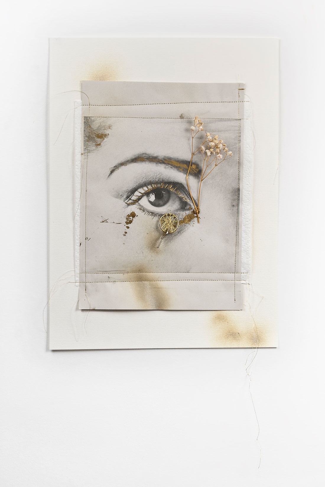 L’opera “Acchiappasogni” parla degli istanti in cui incontriamo e ci connettiamo con una persona sconosciuta attraverso lo sguardo. L’occhio mostra e racconta le storie che la bocca riesce a nascondere: lacrime dorate di sogni rotti, illusioni perse, rinunce che si fanno durante la vita per molte ragioni, a volte per non essere capaci di rompere dei canoni imposti dalla società, altre volte per far piacere alle altre persone, per debolezza, paura, errore… Qualunque sia la ragione o la storia, questi sogni rimangono lì, incompiuti. Intrappolati nel limbo di una ragnatela di fili dorati tessuta ogni giorno sul portachiavi di un diario segreto, o di quella valigia che non osiamo preparare. Quel viaggio che non intraprendiamo, e che, anche se passano gli anni, continua a essere presente nei nostri pensieri, come attratto da una calamita.