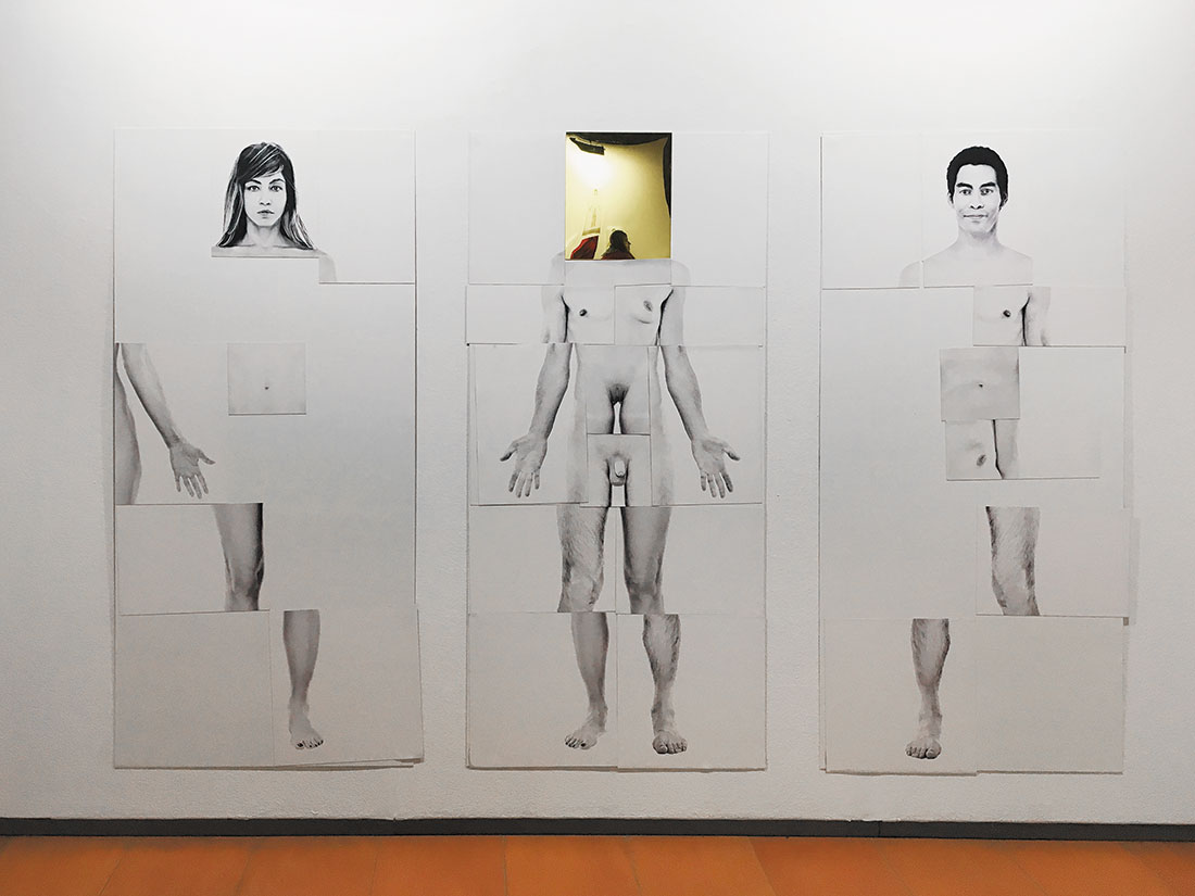 (fotografia su pannelli magnetici di dimensioni variabili, specchio in polistirolo 25 x 30 cm, 3 pannelli di 70 x 150 cm ciascuno).